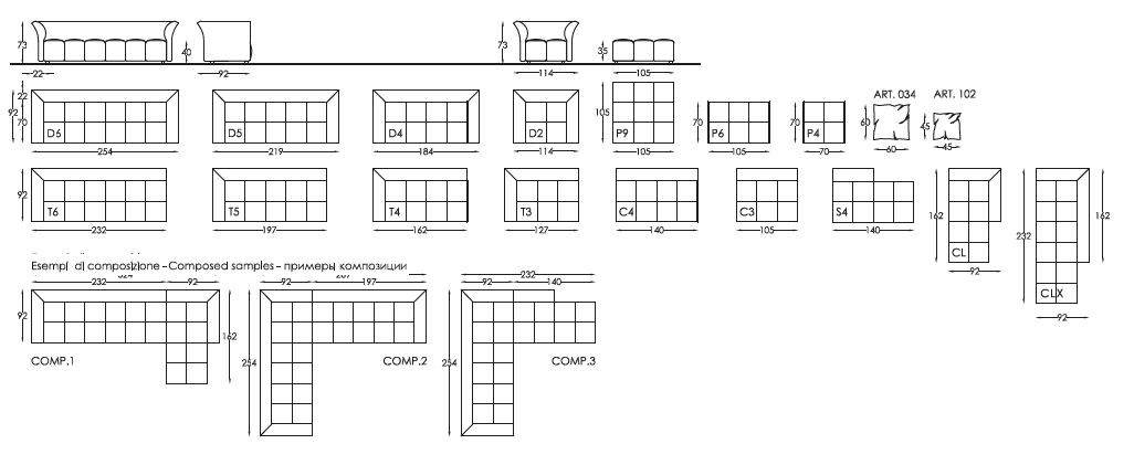 Versioni: divani in varie misure, poltrona, pouf e versione componibile.