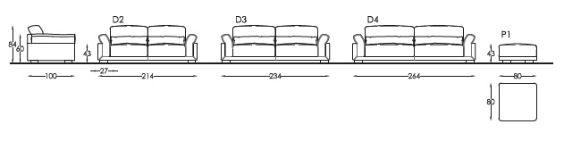 Versioni: divano 3 posti, 2 posti e mezzo e 2 posti, pouf.