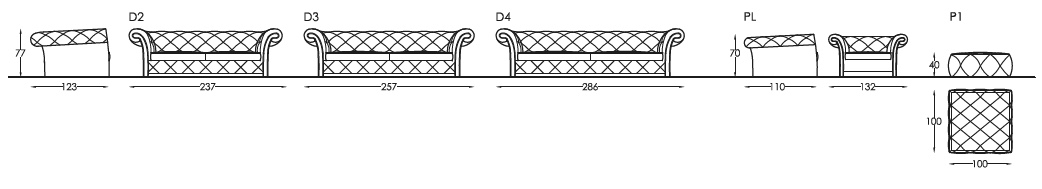 Versioni: poltrona, divano 2 posti, 2 posti e mezzo, 3 posti e pouf